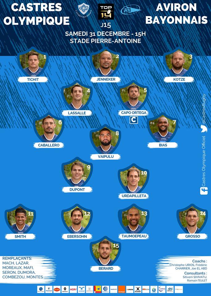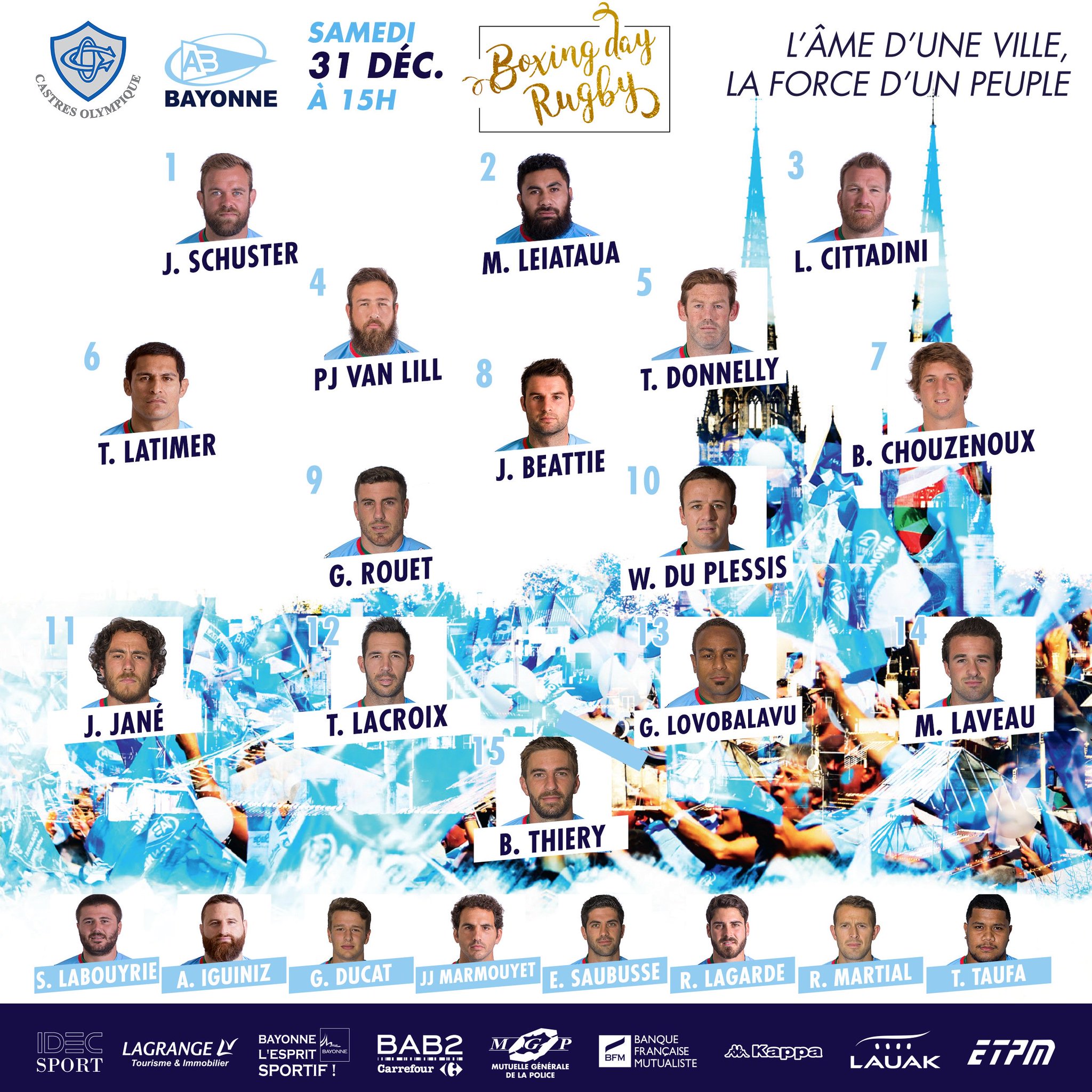 Le faux pas bordelais est l’occasion rêvée pour les castrais de revenir dans le Top 6. La réception de l’Aviron est l’occasion d’engranger un maximum de points. Bayonne semble sans arme, déjà en difficulté à Jean Dauger, le club s’exporte mal. En ce jour de réveillon le CO nous propose une belle équipe avec du lourd en première ligne, Capo Ortega en capitaine et une belle charnière avec Dupont à la mêlée et Urdapilleta à l’ouverture.